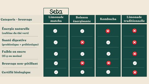 Comparativement aux limonades traditionnelles, notre limonade matcha ne contient que 8g de sucre par canette. Nous y avons incorporé une touche de thé vert matcha pour une énergie douce et prolongée. De plus, elle est enrichie en fibres prébiotiques et en probiotiques pour soutenir une bonne santé digestive. Cette savoureuse limonade, rehaussée d'une note de thé vert, rappelle les délices d'un thé glacé! C'est une boisson rafraîchissante et non-pétillante, parfaite pour te désaltérer.